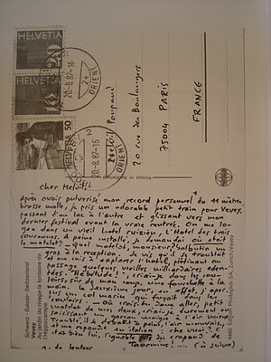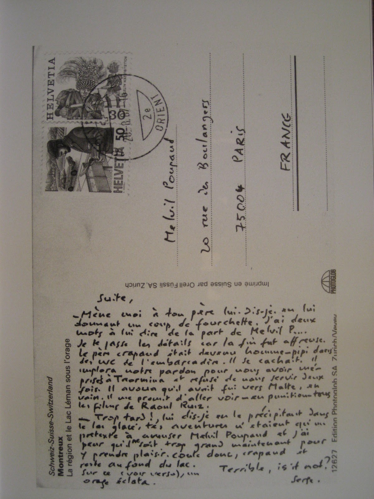 Together, we had invented an imaginary character, who became a kind of guide in our relationship. S.D. had decided to trace back this "Swine", chasing him around the world. He kept me informed of the progress of his secret investigation with the postcards that he sent to me regularly.